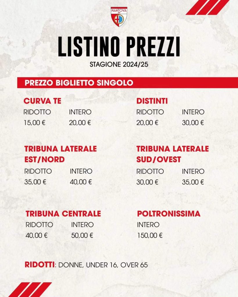 Ufficializzando tale data quale termine ultimo per sottoscrivere le tessere, il MantovaĀ ha anche ufficializzato oggi i prezzi dei biglietti dei vari settori per le singole partite. La Curva Te potrebbe in realtĆ andare esaurita prima del termine, anche se non escluso che la societĆ biancorossa lasci una piccola quota di posti disponibili per la vendita libera, come accaduto lo scorso anno. In questo caso il biglietto intero costa 20 euro, 15 invece il ridotto destinato a donne, under 16 e over 65. Il costo del singolo biglietto intero del settore distinti ĆØ di 30 euro (ridotto 20).